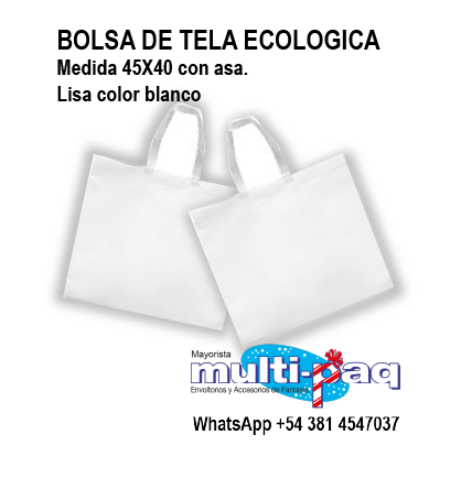 Bolsa de tela ecológica blanca muy versátil. Imprimible con tu logo y fácil de personalizar. La medida es de 45 cm. de ancho por 40 cm. de alto y tiene un fuelle inferior de 5 cm lo qeu la amplía un poquito mas.