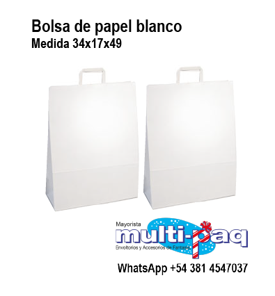 Bolsa de papel de 34 x 17 x 49 cm color blanco. La manija es de papel plegado lo que permite un menor costo sin perder resistencia. Ideal para transportar productos de mayor tamaño. Excelente packaging para indumentaria, cajas y productos voluminosos.
