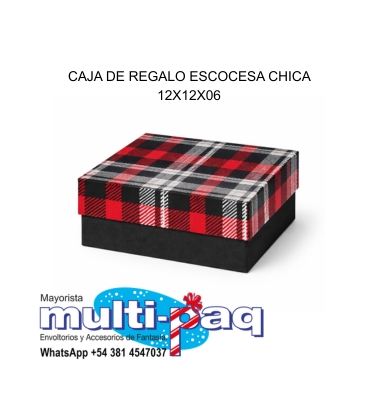 Caja de regalo modelo escocesa tamaño chica, ideal para presentar obsequios, accesorios y pequeños productos con una terminación elegante y llamativa. Su diseño tipo tartán en tonos rojos, negros y blancos aporta un estilo clásico y distintivo.