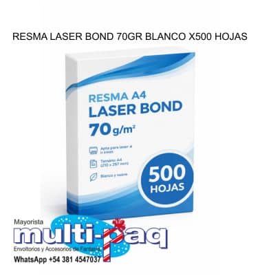 Resma de papel blanco tipo Laser Bond, de 70 gramos, pensada para un uso versátil en oficinas, comercios, escuelas y hogares. Brinda una impresión limpia y uniforme, compatible con impresoras láser, inkjet y fotocopiadoras.